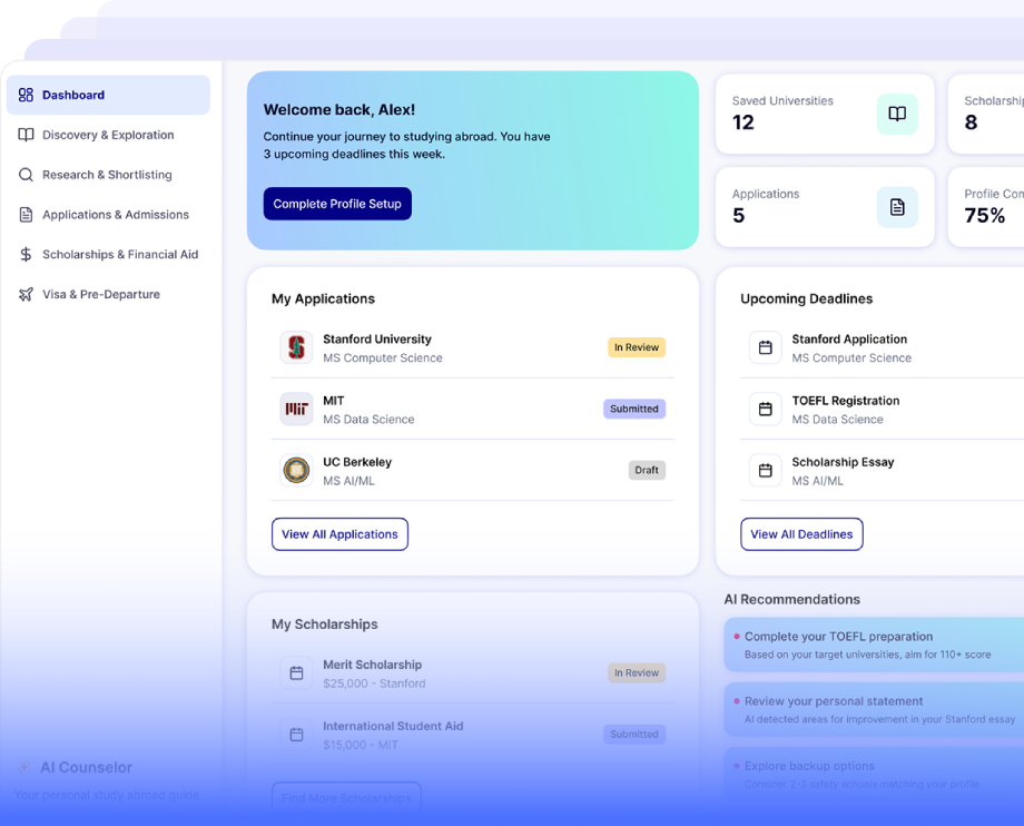 Essays, documents, deadlines — everything organized in one intelligent platform. You’ll always know what to do next, with real-time guidance from your AI co-pilot.